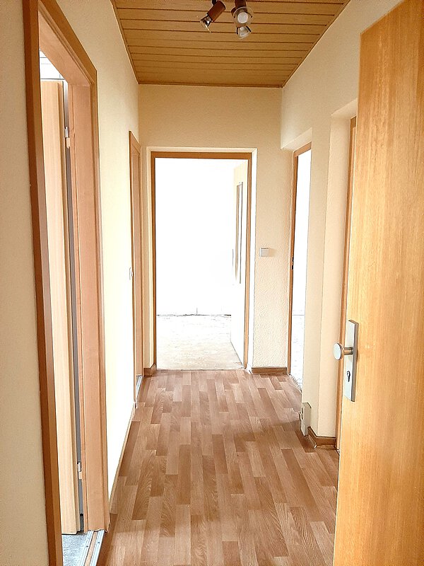 - alle Fußböden in der Wohnung wurden erneuert und schwellenlos ein PVC-Fußbodenbelag in Laminatoptik verlegt;